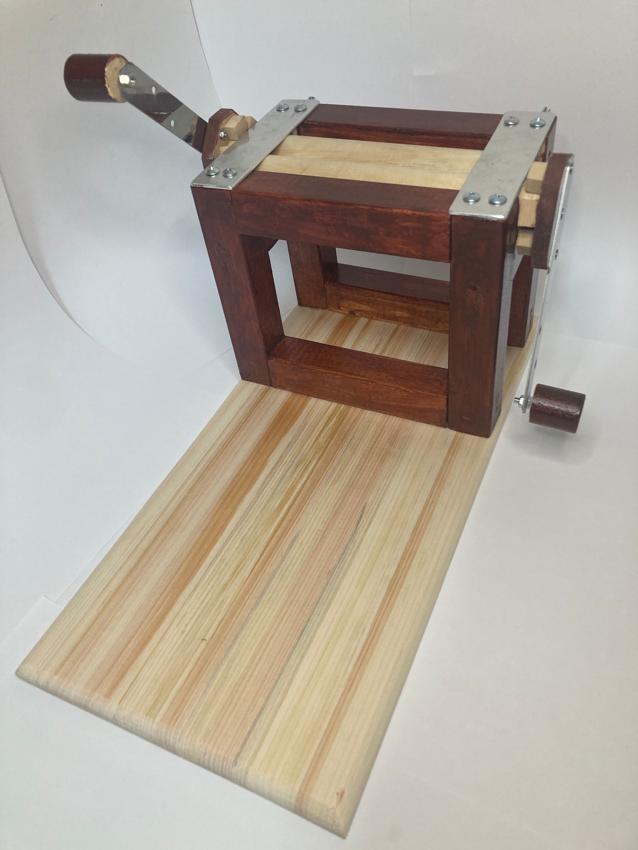 先日、簡易型綿繰り機をご注文いただいて、発送しましたので、在庫不足の恐れがありましたので、2号機(実際は試作機を含めると3号機ですが)を製作し、昨日完成しました。改良箇所は、サイズをやや小さくしたこと以外は、1号機と変わりはありません。試しに綿繰りをしてみましたが、ほぼ確実に種とワタを分けてくれます。また、これまでの縦型構造の綿繰り機と比べて、ワタをローラー溝に置くだけなので、両手をローラー回転に使えます。